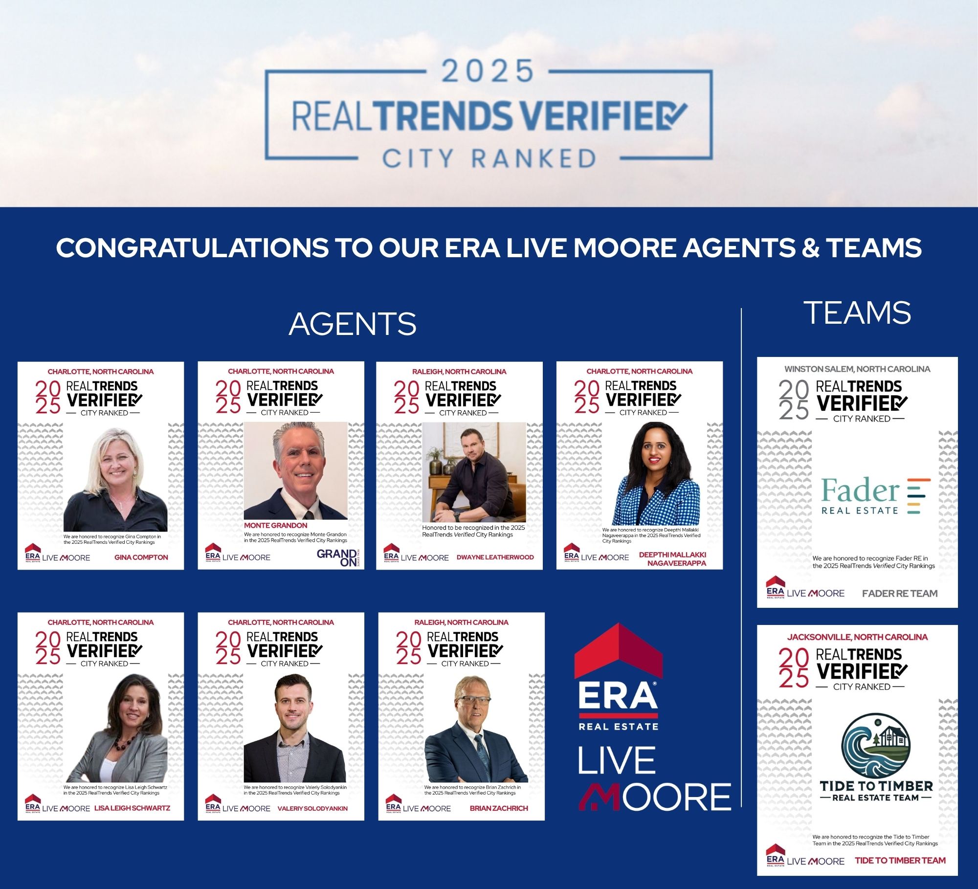 At ERA Live Moore, we believe that excellence is achieved through hard work, collaboration, and a commitment to delivering remarkable experiences for every client. That’s why we’re proud to announce our agents and teams who have been recognized in the 2025 RealTrends Verified City Rankings, celebrating top-producing real estate professionals nationwide.