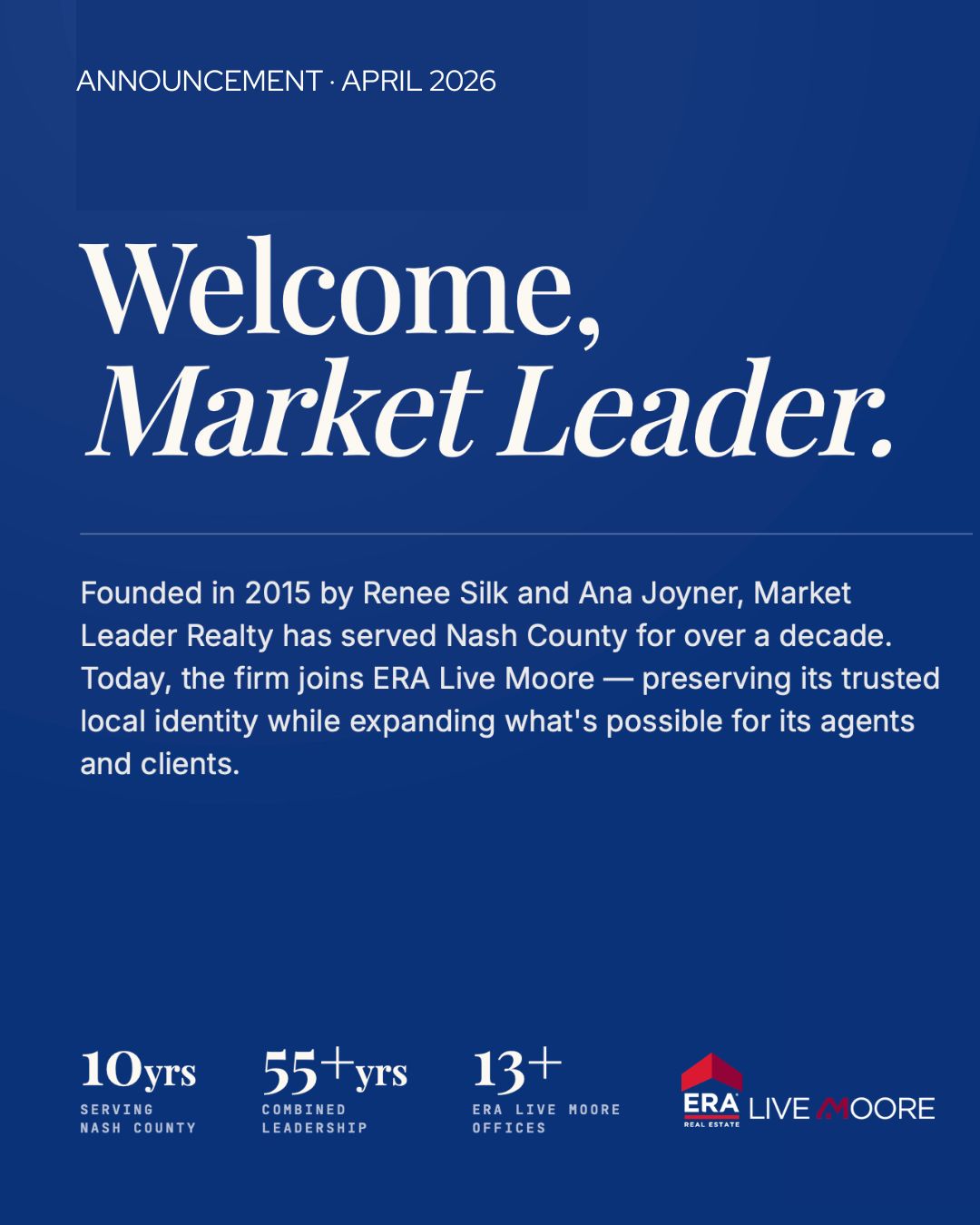 “We are thrilled to welcome the Market Leader Realty team into the ERA Live Moore family. Renee, Ana, and their agents have spent years building something truly special in Nashville and Nash County — a culture of trust, integrity, and genuine care for their clients. Our goal is to honor that legacy while opening new doors for every agent on their team.”